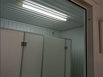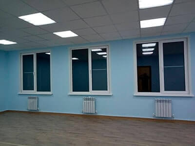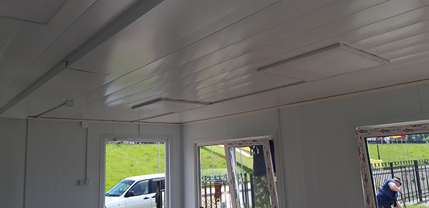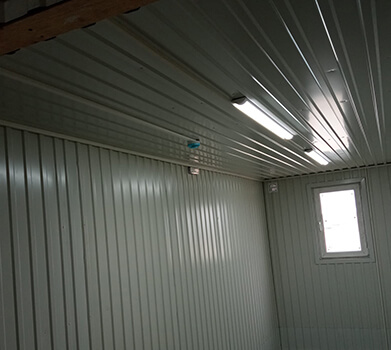 Потолки были смонтированы из панелей ПВХ в цвет к окраске внутренних поверхностей сэндвич-панелей. На потолке размещены светодиодные светильники.