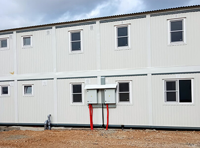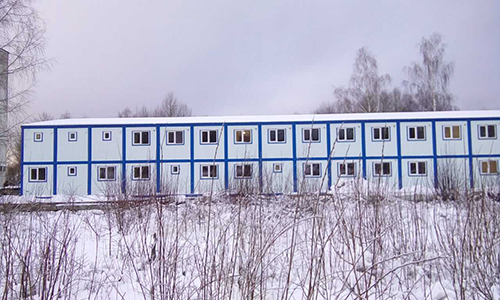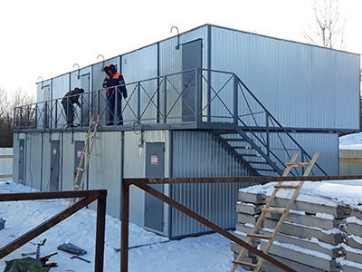 Многие строительные компаниири возведении многоэтажных жилых домов на территории строительства размещают строительные-комплексы - модульные здания из нескольких бытовок, выставленных в ряд, а также друг на друга.
