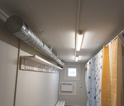 В составе помещений были предусмотрены и сушилки, чтобы рабочим можно было просушить промокшую под дождем иснегом одежду. Изнутри сушилки обшивались оцинкованным профлистом. Он прекрасно служит в качестве отражателя тепловой энергии, нагоняемой конвекторами внутри помещения.