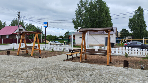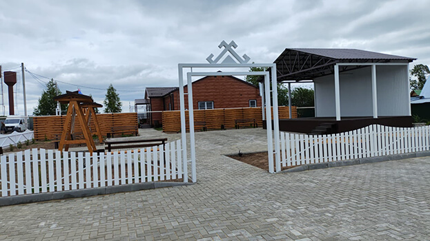 На территории клуба была выложена брусчатка и установлены малые архитектурные формы - детские качели, скамейки, урны, и уличная сцена.