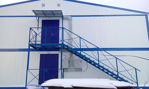 Этажность здания - 2 этажа. Лестничные пролеты смонтированы внутри здания. Также имеется пожарная металлическая лестница, смонтированная снаружи с торца здания.