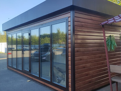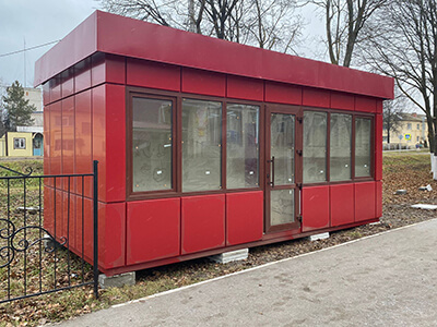 Данный павильон был изготовлен из сэндвич-панелей, благодаря чему оно имеет более современный и аккуратный вид.