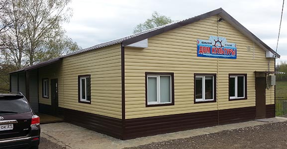 Внешняя обшивка дома культуры выполнена из металлосайдинга. Нижняя часть, закрывающпя фундамент из профлиста шоколадного цвета.
