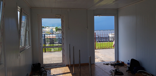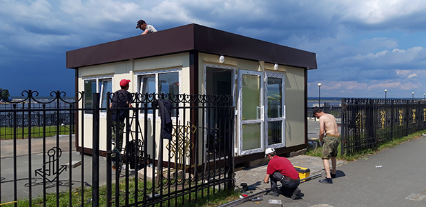 Для нужд речного порта г. Чебоксары нами было изготовлено модульное здание для прохода пассажиров к отходящим суднам - катерам, пароходам и другому водному транспорту.