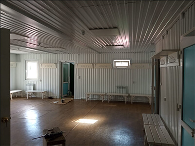 Внутренняя отделка помещений была выаолнена из листов ламинированной ДСП, санузлы - окрашенный профлист белого цвета и стекломагниевый лист, сушилки - оцинкованный профильный лист. Полы деревянные, утепленные, многослойные с чистовым покрытием из полукоммерческого линолеума. Потолки - стекломагниевый лист, окрашенный и оцинкованный профлист