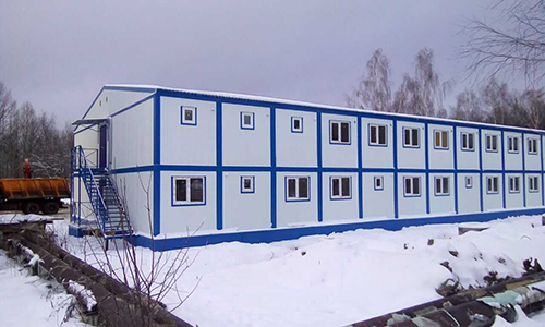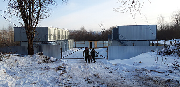 Многие строительные компаниири возведении многоэтажных жилых домов на территории строительства размещают строительные-комплексы - модульные здания из нескольких бытовок, выставленных в ряд, а также друг на друга.