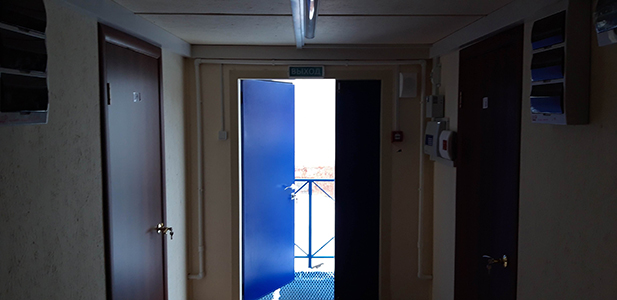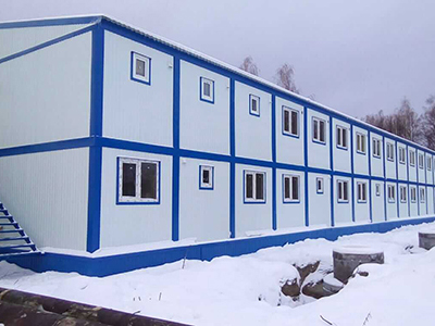Внешняя обшивка общежития выполнена из окрашенного профлиста. Собрано здание из отдельных модулей, которые стыковались и устанавливались друг на друга. Основная часть которых была произведена на заводе. Коридор между помещениями был собран по месту.