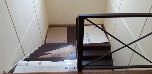 Внутренняя лестница между этажами устроена двумя пролетами с лестничной площадкой между ними. Лестница металлическая, ступени, приступки облагорожены отделочными материалами.