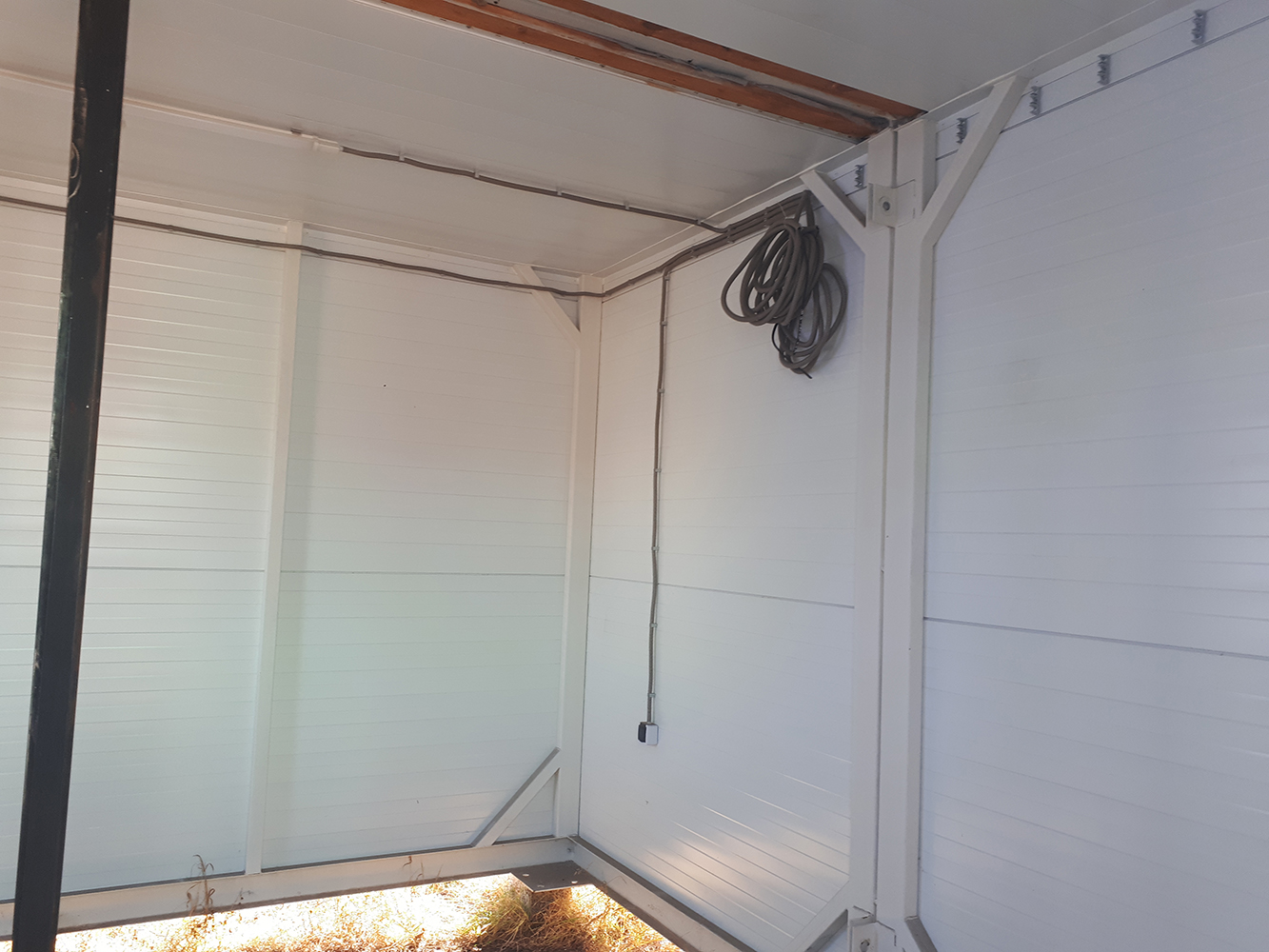 Крыша, одновременно является и потолком, выполнена из кровельной сэндвич-панели. Высота ската - 150 мм. Стандартный комплект электропроводки в наличии.
